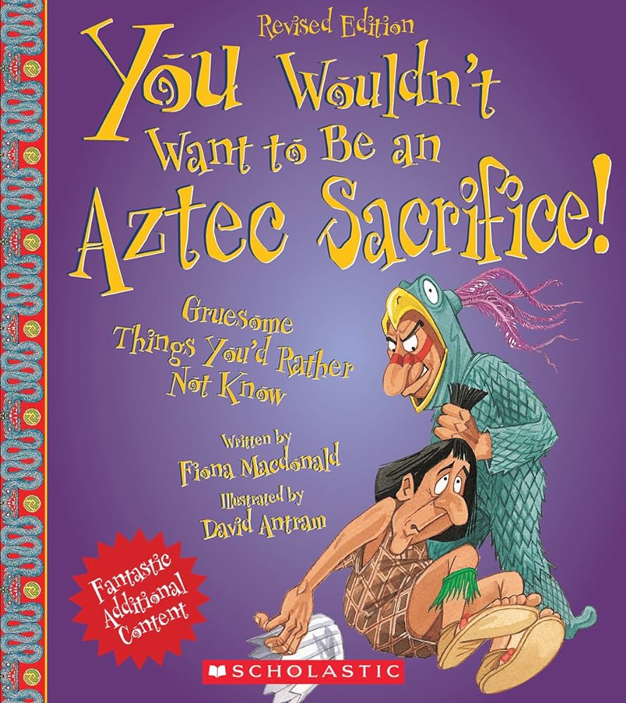 "You Wouldn't Want to Be an Aztec Sacrifice!" by Fiona MacDonald and illustrated by David Antram